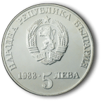На лицевата страна на монетата е държавният герб на Народна република България, а под него са годината на емисия „1988” и номиналната стойност „5 ЛЕВА”. Отгоре околовръст има надпис „НАРОДНА РЕПУБЛИКА БЪЛГАРИЯ”. |