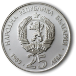 На лицевата страна на монетата в центъра е разположен държавният герб на Народна република България. Околовръст има надписи: „НАРОДНА РЕПУБЛИКА БЪЛГАРИЯ”, „25 ЛЕВА”, както и годината на емисия „1989”. |