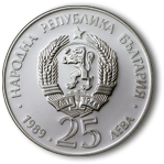На лицевата страна на монетата в центъра е разположен държавният герб на Народна република България. Околовръст има надписи: „НАРОДНА РЕПУБЛИКА БЪЛГАРИЯ”, „25 ЛЕВА”, както и годината на емисия „1989”. |