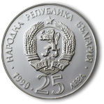 На лицевата страна на монетата в центъра е разположен държавният герб на Народна република България. Околовръст има надписи: „НАРОДНА РЕПУБЛИКА БЪЛГАРИЯ”, числото на номиналната стойност „25 ЛЕВА”, както и годината на емисия „1990”. |