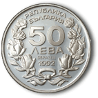На лицевата страна на монетата в центъра е числото на номиналната стойност „50”, под него има надпис „ЛЕВА” и годината на емисия „1992”. Над тях на два реда е разположен надпис „РЕПУБЛИКА БЪЛГАРИЯ”. Композицията е рамкирана от стилизиран венец от рози, привързан долу с панделка. |