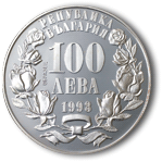 На лицевата страна на монетата в центъра е числото на номиналната стойност „100”, под него – надпис „ЛЕВА” и годината на емисия „1993”. Над тях на два реда има надпис „РЕПУБЛИКА БЪЛГАРИЯ”. Композицията е рамкирана от стилизиран венец от рози, привързан долу с панделка. |