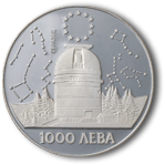 На лицевата страна на монетата в центъра е изобразена астрономическата обсерватория на връх Рожен на фона на иглолистна гора и съзвездия на небето. Над купола на обсерваторията има кръг от дванадесет петолъчни звезди, а отдолу – надпис „1000 ЛЕВА”. |