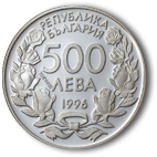 На лицевата страна на монетата в центъра е числото на номиналната стойност „500”, под него – надпис „ЛЕВА” и годината на емисия „1996”. Над тях на два реда има надпис „РЕПУБЛИКА БЪЛГАРИЯ”. Композицията е рамкирана от стилизиран венец от рози, привързан долу с панделка. |