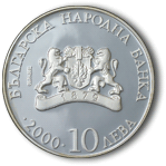На лицевата страна на монетата в центъра е изобразена емблемата на БНБ, околовръст са изписани числото „10”, текстовете „ЛЕВА” и „БЪЛГАРСКА НАРОДНА БАНКА”, както и годината на емисия „2000”. |
