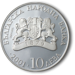 На лицевата страна на монетата в центъра е изобразена емблемата на БНБ, околовръст са изписани: числото „10”, текстовете „ЛЕВА” и „БЪЛГАРСКА НАРОДНА БАНКА”, както и годината на емисия „2001”. |