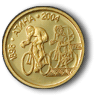 На обратната страна на монетата e изобразен състезател по колоездене на фона на друг от първите съвременни олимпийски игри. Околовръст е разположен надпис „1896 • АТИНА • 2004”. |