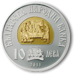 На лицевата страна на монетата са изобразени: фрагмент от миниатюра от Манасиевата хроника – хан Крум вдига наздравица със славянските владетели; емблемата на Българската народна банка с изписана върху лентата „1879” година; номиналната стойност „10 ЛЕВА” и годината на емисия „2011”. Околовръст по външния пръстен е изписан текстът „БЪЛГАРСКА НАРОДНА БАНКА”. |