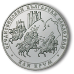 На обратната страна на монетата във вътрешния кръг е изобразен фрагмент от миниатюра в Манасиевата хроника – хан Крум преследва ромеите. Околовръст по външния пръстен са изписани текстовете „СРЕДНОВЕКОВНИ БЪЛГАРСКИ ВЛАДЕТЕЛИ” и „ХАН КРУМ”. |