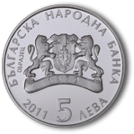 На лицевата страна на монетата е изобразена емблемата на Българската народна банка с годината „1879”, изписана върху лентата. Околовръст са изписани „БЪЛГАРСКА НАРОДНА БАНКА”, номиналната стойност „5 ЛЕВА” и годината на емисия „2011”. |
