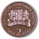 На лицевата страна на монетата е изобразена емблемата на Българската народна банка с годината „1879”, изписана върху лентата. Околовръст са изписани „БЪЛГАРСКА НАРОДНА БАНКА”, годината на емисия „2012” и номиналната стойност на монетата „2 ЛЕВА”. |