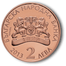 На лицевата страна на монетата е изобразена емблемата на Българската народна банка с годината „1879”, изписана върху лентата. Околовръст са изписани „БЪЛГАРСКА НАРОДНА БАНКА”, номиналната стойност „2 ЛЕВА” и годината на емисия „2013”. |