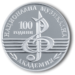 На обратната страна на монетата са изобразени: в средата петолиние с ключ сол във вид на стилизирана птица и вляво от него надпис „100 години“; околовръст надпис „НАЦИОНАЛНА МУЗИКАЛНА АКАДЕМИЯ“ и две стилизирани лаврови клонки. |