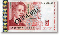 Защитни елементи Антикопирна ивица - холограмна лента: цифрата „5“, която пулсира, преливайки в различни цветове, и изображение на глава на момче и стилизирано цвете, които се редуват при промана на ъгъла на на наблюдение. Деметализиран кант на холограмната лента с минитекст „БЪЛГАРСКА НАРОДНА БАНКА 5“. Осигурителна нишка - вградена в хартията метализирана нишка с холограмен ефект - преливане на цифрата „5“ в различни зветове при промяна на ъгъл на наблюдение, съдържаща минитекст „БНБ 5“ и частично излизаща от другата страна на банкнотата; притежава и специален поляризиращ ефект. Воден знак - полутоново изображение на портрета от банкнотата; контрастно изображение на инициалите „БНБ“. Флуоресценция - на ултравиолетова светлина при 365 нм дължина на вълната: влакънцата в хартията светят в синьо, зелено и червено; на лицевата страна на банкнотата в зоната вдясно от холограмната лента ивицата от повтарящи се цифри „5“ и серийните номера светят в зелено; зоната вдясно от портрета свети в червено; на обратната страна изображенията на жената с младенеца и жетварката светят в зелено. На обратната страна на банкнотата изображение на глава на момче свети в червено при 365 нм дължина на вълната, а при 254 нм - в зелено. Регистър на проглед - правоъгълно шахматно поле, в което при поставяне срещу източник на светлина се наблюдава цифрата „5“. Микро-текст на лицевата страна - хоризонтални линии текст „ИВАН МИЛЕВ“ във фона вляво от портрета; две вертикални линии вдясно от портрета - текст „ИВАН МИЛЕВ" и текст „5 ЛЕВА“, запълващ цифрата „5“. Микро-текст на обратната страна - линии с текст "ИВАН МИЛЕВ" и „1897 1927“ оформят ивица в лявата част на основната мрежа и изпълват ръкава на жетварката; цифрата „5“ в полето под него. Скрит образ - вдясно от холограмната лента при наблюдение под ъгъл 15 - 20 градуса се появява текст „5 ЛЕВА“. Релефен печат - портретът на Иван Милев; текстовете „БЪЛГАРСКА НАРОДНА БАНКА“ и „ПЕТ ЛЕВА“; цифрата „5“, винетката и текстът „5 ЛЕВА“ върху холограмната лента. Знак за незрящи граждани - релефно изображение на два еднакви триъгълника, насочени нагоре, разположени един под друг. |