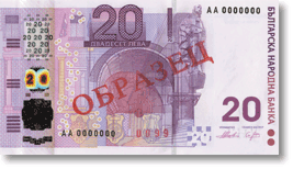 Осигурителна нишка - вградена в хартията лента с негативен минитекст „БНБ 20”, частично излизаща от обратната страна на банкнотата и променяща цвета си от лилав в зелен. Регистър на проглед – изображение на числото „20” се оформя в правоъгълно шахматно поле при наблюдение срещу светлина. Мастило с променящ се цвят (OVI) – числото „20” в долния десен ъгъл на лицевата страна на банкнотата променя цвета си от лилав в зелен при промяна на ъгъла на наблюдение. Знак за незрящи граждани – релефно изображение на два кръга, разположени един над друг. |